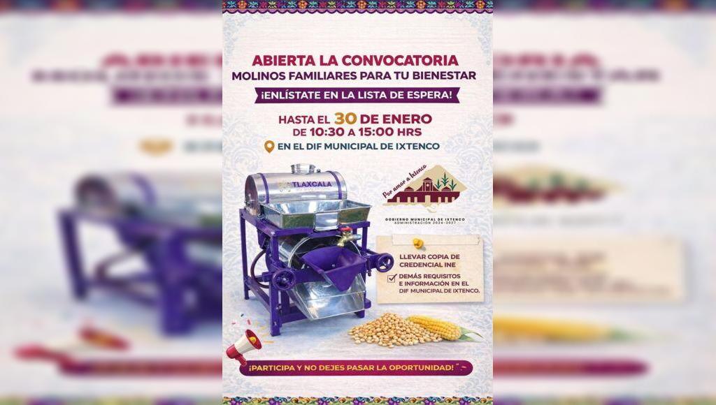 DebatePublico.- En coordinación con la Secretaría de Bienestar del Estado de Tlaxcala, el Gobierno Municipal de Ixtenco, encabezado por la presidenta municipal Aline Lazo Caballero, y el Sistema Municipal DIF, que preside Alicia Caballero Yonca, se informa a la población que se encuentra abierta la convocatoria para integrarse a la lista de espera del programaSigue leyendo "Lista de espera para acceder a un molino gratuito abierta hasta el 30 de enero en Ixtenco."