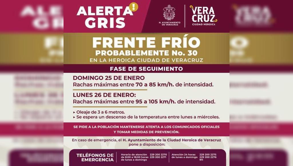 DebatePúblico.- La Dirección de Protección Civil Municipal de Veracruz informa que se activa la Alerta Gris ante el ingreso del Frente Frío (probable) No. 30, previsto para este domingo, con descenso de temperatura y viento del norte con rachas de 80 a 95 km/h, especialmente durante la noche y madrugada. Se prevé ambiente fresco aSigue leyendo "Alerta Gris por el Frente Frío (probable) No. 30 en la ciudad de Veracruz"