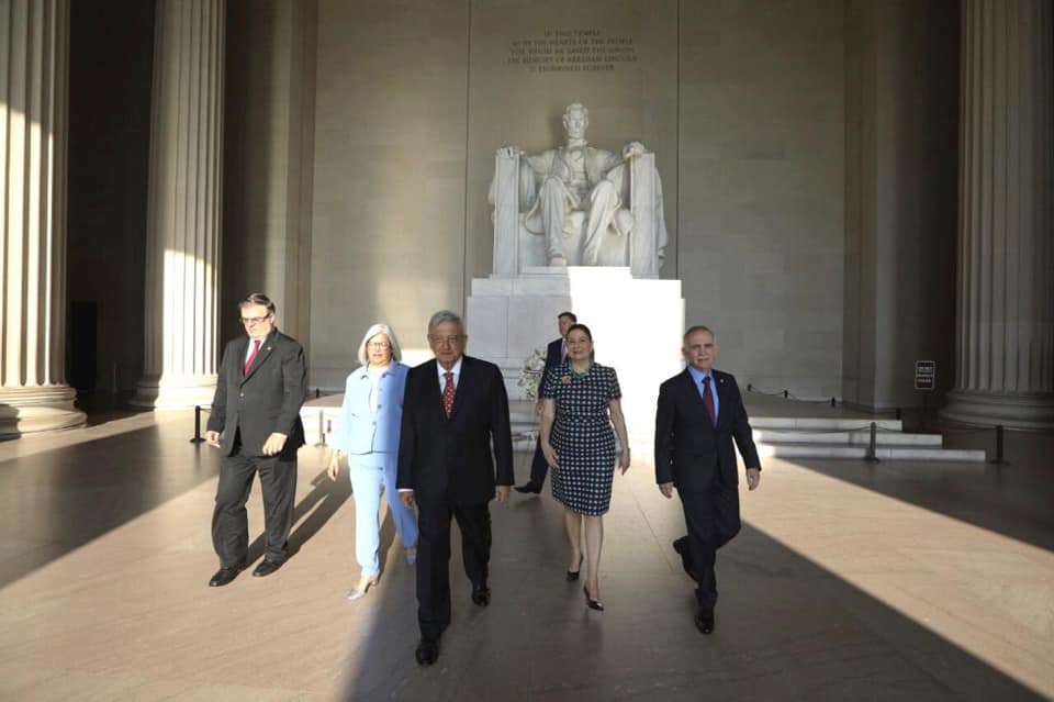 El presidente de México, Andrés Manuel López Obrador, participa en la ceremonia para depositar ofrenda floral en el monumento a Benito Juárez, en Washington D.C.