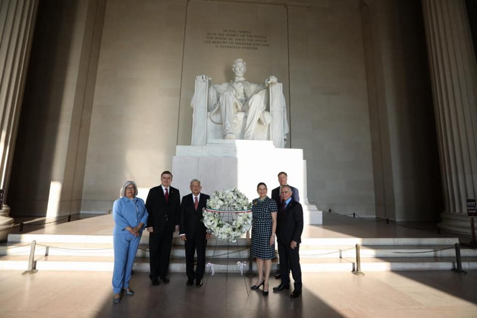 El presidente de México, Andrés Manuel López Obrador, participa en la ceremonia para depositar ofrenda floral en el monumento a Benito Juárez, en Washington D.C.