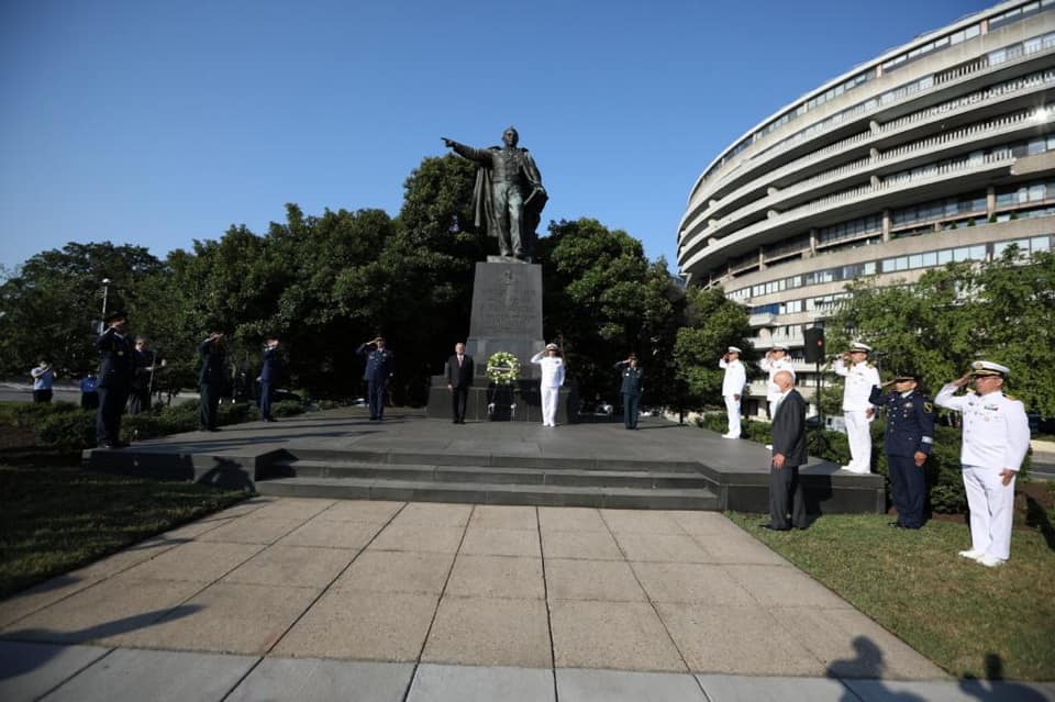 El presidente de México, Andrés Manuel López Obrador, participa en la ceremonia para depositar ofrenda floral en el monumento a Benito Juárez, en Washington D.C.