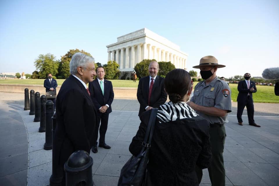 El presidente de México, Andrés Manuel López Obrador, participa en la ceremonia para depositar ofrenda floral en el monumento a Benito Juárez, en Washington D.C.