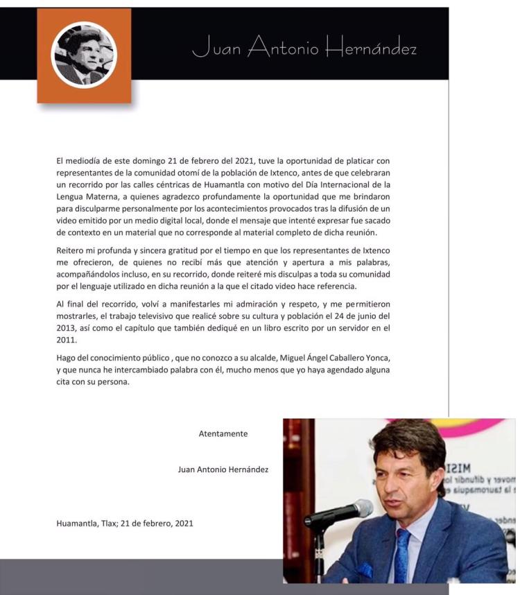 “El mediodía de este domingo 21 de febrero del 2021, tuve la oportunidad de platicar con representantes de la comunidad otomí de la población de Ixtenco, antes de que celebraran un recorrido por las calles céntricas de Huamantla con motivo del Día Internacional de la Lengua Materna, a quienes agradezco profundamente la oportunidad que me brindaron para disculparme personalmente por los acontecimientos provocados tras la difusión de un video emitido por un medio digital local, donde el mensaje que intenté expresar fue sacado de contexto en un material que no corresponde al material completo de dicha reunión”.