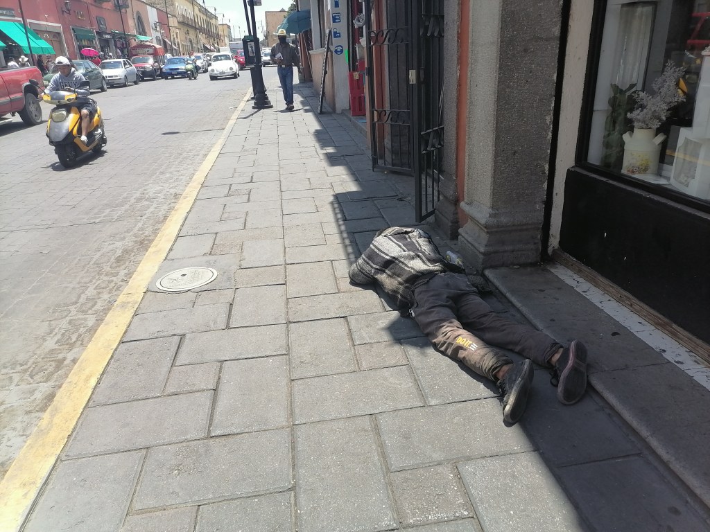 Relataron que hay una persona del sexo masculino que frecuentemente y a plena luz del día, duerme en la banqueta de la avenida Juárez, cerca del andador San Luis, y es necesario que las autoridades sanitarias tomen cartas en el asunto, ya que se trata de una persona con problemas de adicciones y que en ocasiones se comporta de manera violenta.