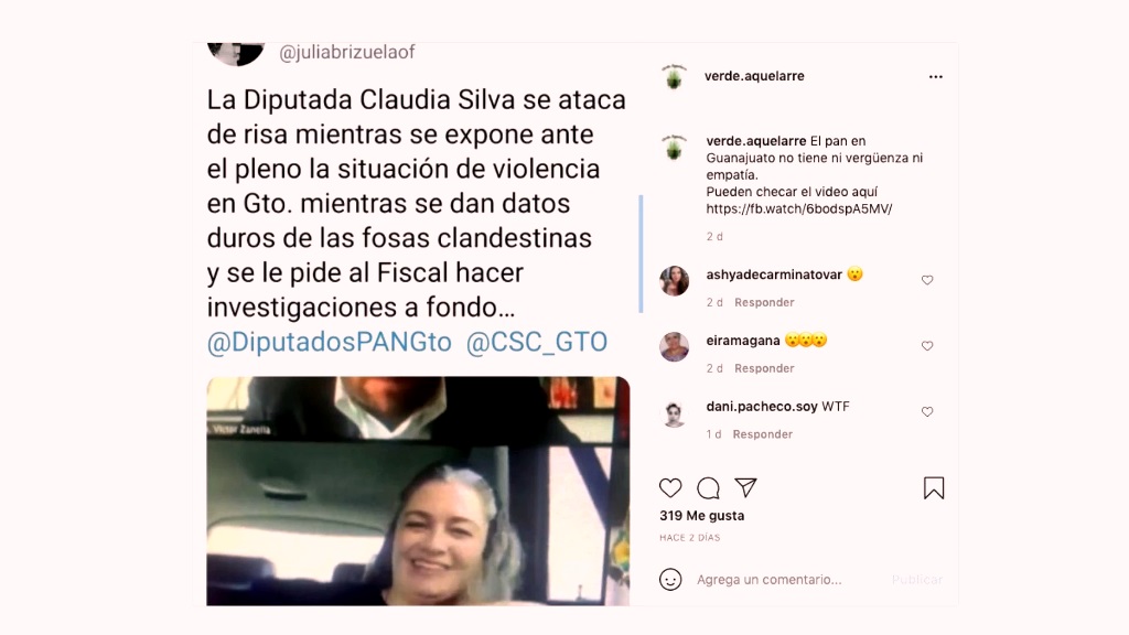 En videos compartidos por redes sociales de la sesión del 17 de junio, se observa que la diputada Claudia Silva se comienza a reír mientras ante el pleno un diputado exponía una intervención sobre la inseguridad en la entidad.