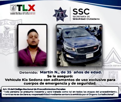 ManuelRojas.- La Secretaria de Seguridad Pública (SSC) informó que el detenido, identificado como Martín N., de 35 años de edad, transportaba a 15 migrantes indocumentados en un vehículo, el cual, portaba aditamentos exclusivos de uso policial, en un hecho ocurrido este fin de semana en el Municipio de Huamantla.