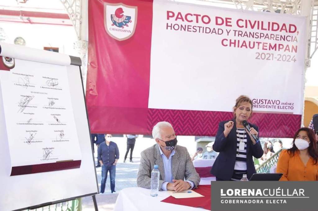 ManuelRojas.- La gobernadora electa de Tlaxcala, Lorena Cuellar Cisneros, realizó la firma del “Pacto de Civilidad, Honestidad y Transparencia por Chiautempan, que se refiere al compromiso de trabajo honesto, responsable y transparente.