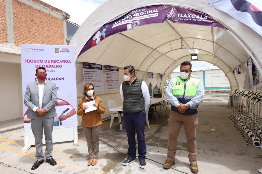 La gobernadora del estado de Tlaxcala, Lorena Cuéllar Cisneros inauguró este lunes el Kiosco de Recarga de Oxigeno Gratuito en el municipio de Calpulalpan, con la finalidad de apoyar a las familias tlaxcaltecas que tienen pacientes con Covid-19, pues se ahorrarán en promedio más de 15 mil pesos.