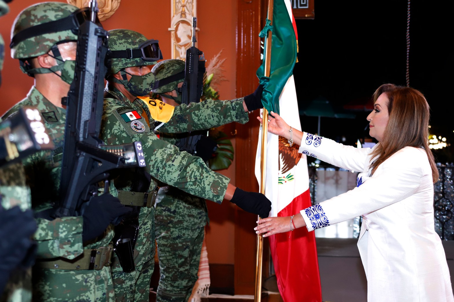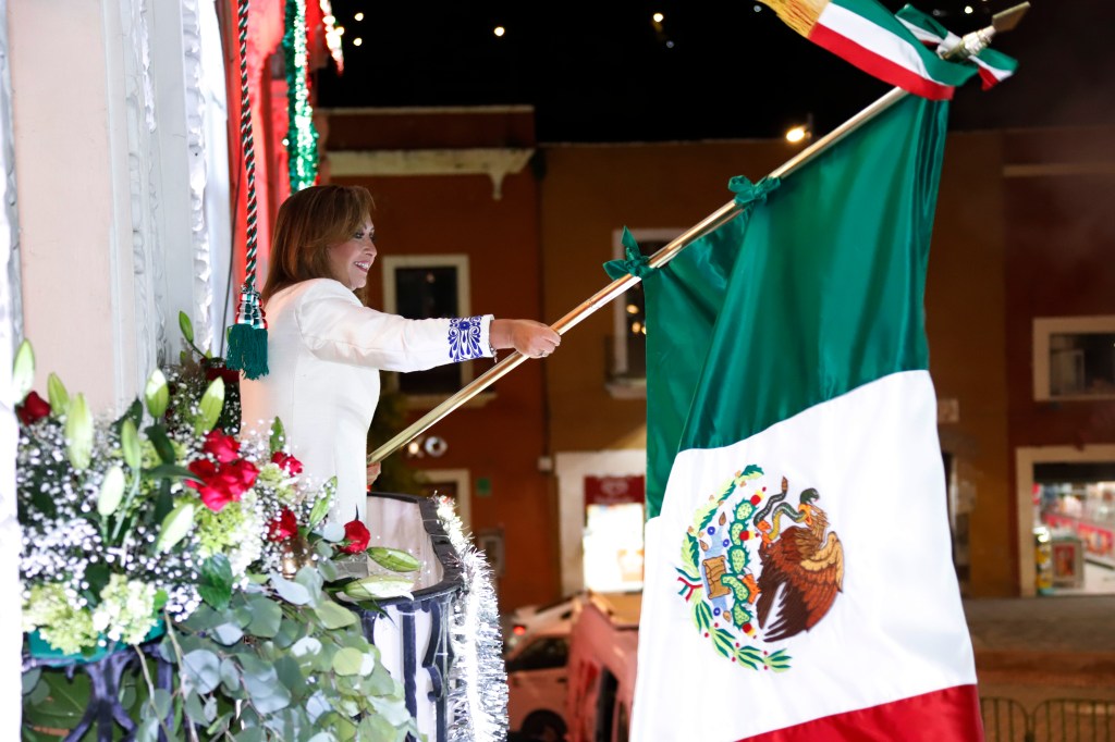 En el balcón central ondeó la Bandera Nacional y vitoreó a los héroes Miguel Hidalgo, José María Morelos y Pavón, Josefa Ortiz de Domínguez, Ignacio Allende, Juan Aldama, Mariano Matamoros, Vicente Guerrero, así como a México y Tlaxcala, en lo que fue su primer Grito de Independencia.