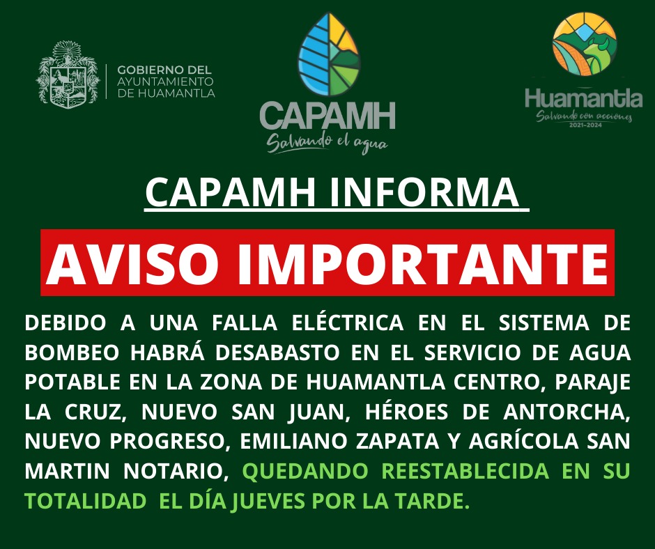 ManuelRojas.- La Comisión de Agua Potable y Alcantarillado del Municipio de Huamantla (CAPAMH), informó que debido a una falla eléctrica en el sistema de bombeo, habrá desabasto en el servicio de agua potable en la zona centro de la ciudad de Huamantla.