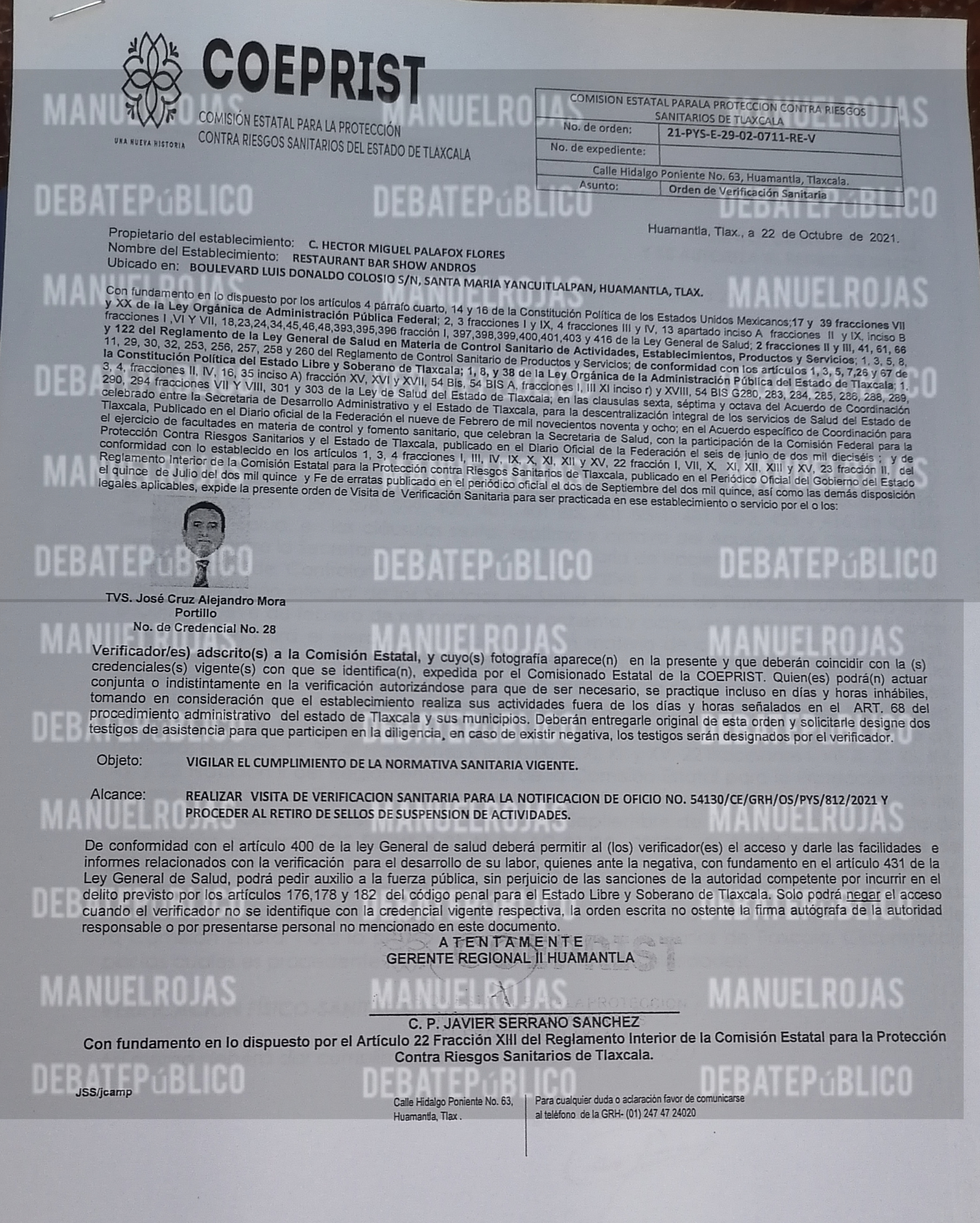 Durante la entrevista sostuvo que él no tiene nada que ver con el cierre de un establecimiento ubicado en el centro de la ciudad de Huamantla, específicamente en la calle Allende, hecho que ocurrió el sábado 23 de octubre, y manifestó que ese día tanto Protección Civil Municipal y del Estado realizaron una supervisión en «Andros» y no encontraron ninguna irregularidad, por lo que su actividad continúo hasta pasada la media noche.