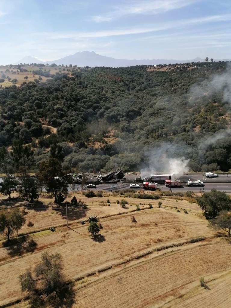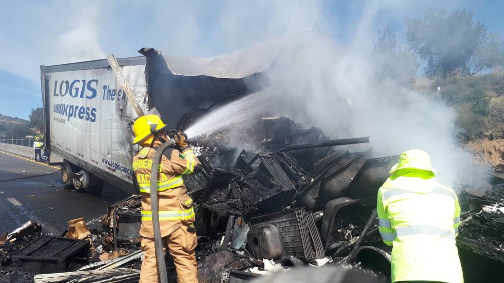 Al mismo tiempo, se reportó que las unidades involucradas en el accidente transportaban contenedores de plástico, mezclilla y materiales para construcción. El fuego los consumió en su totalidad.