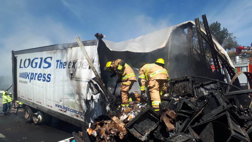 Al mismo tiempo, se reportó que las unidades involucradas en el accidente transportaban contenedores de plástico, mezclilla y materiales para construcción. El fuego los consumió en su totalidad.