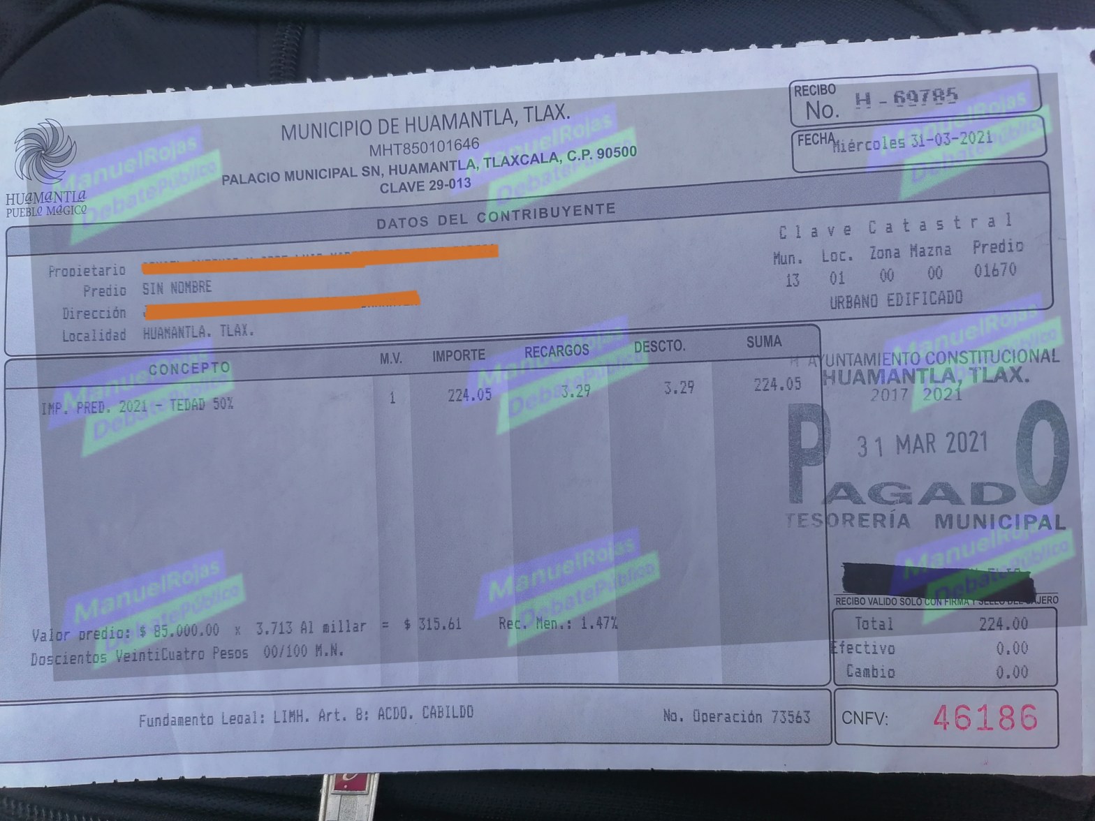 Le entregan el papel que comprobaba que ya no debía el impuesto predial, pero al revisarlo se da cuenta que el recibo era por 224 pesos, eso sí, estaba bien sellado, pero sin duda algo estaba mal. Por lo que reclamo, y la respuesta que le dio Daniel García es que no había ningún problema, porque con ese recibo en el que sólo estaba plasmado el pago del predial del año 2021, en los próximos años sólo le cobrarían 224 pesos.