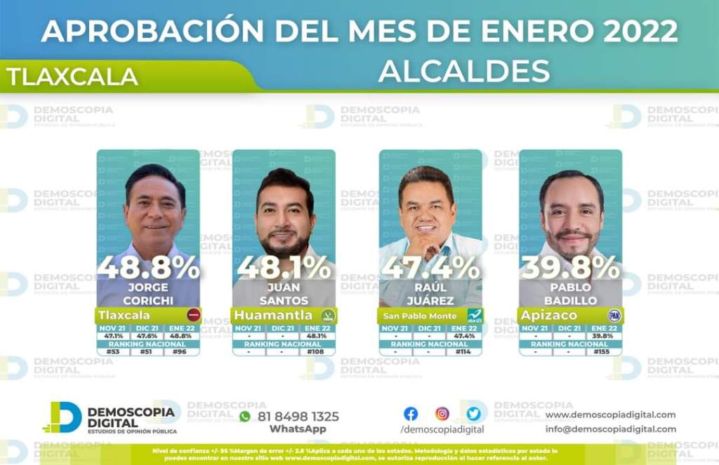 ManuelRojas.- La empresa Demoscopia Digital publicó los resultados del Ranking Nacional de Alcaldes por entidad federativa, y en el caso del Estado de Tlaxcala, el presidente municipal de Huamantla, Salvador Santos Cedillo, aparece como uno de los servidores públicos con mejor aprobación durante el mes de enero de este 2022.