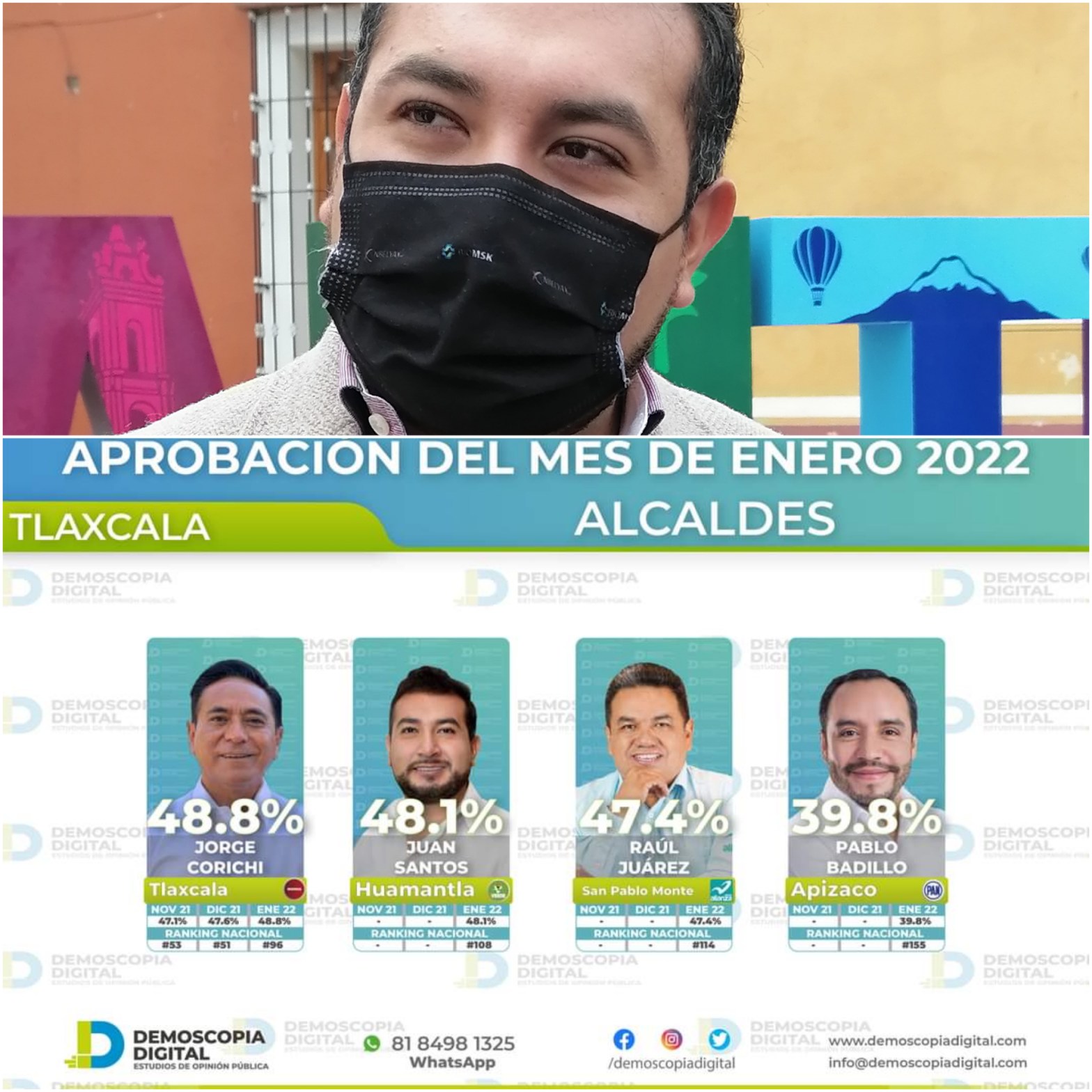 ManuelRojas.- La empresa Demoscopia Digital publicó los resultados del Ranking Nacional de Alcaldes por entidad federativa, y en el caso del Estado de Tlaxcala, el presidente municipal de Huamantla, Salvador Santos Cedillo, aparece como uno de los servidores públicos con mejor aprobación durante el mes de enero de este 2022.