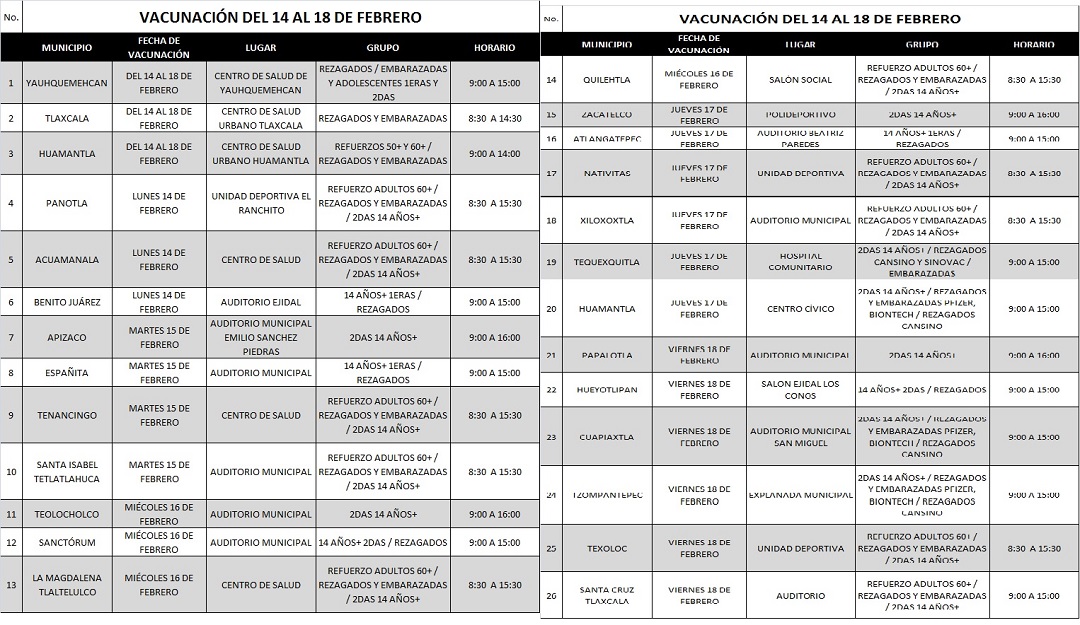 El lunes 14 se vacunará en la Unidad Deportiva de Panotla, el Centro de Salud de Acuamanala y el Auditorio Ejidal de Benito Juárez.