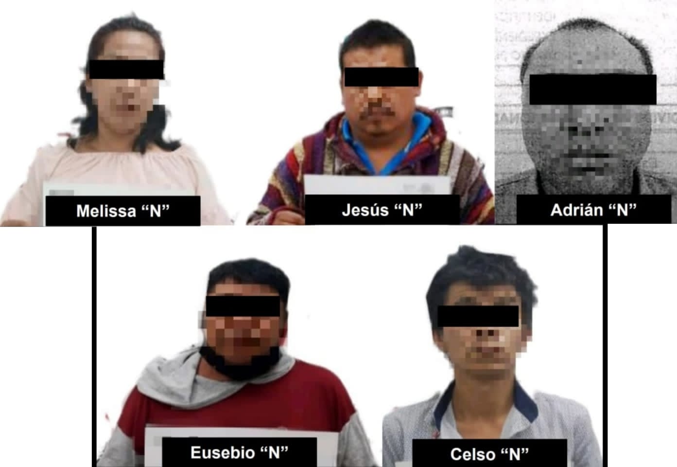 Dentro de las personas aprehendidas está Melissa “N” quien fue detenida en la delegación de Iztapalapa de la CDMX, Jesús “N” en la colonia San Matías, Puebla, Adrián “N” fue aprehendido en el municipio de Chalco de Díaz Covarrubias del Estado de México, y Eusebio “N” en San Diego Metepec, Tlaxcala.