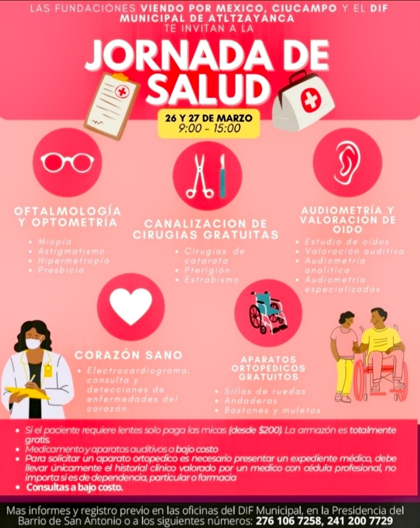 Ante esto, el Gobierno Municipal de Atltzayanca informo que está Jornada de Salud está abierta para que asistan las familias de todas las comunidades que integran el Municipio, ya que es muy importante señalar que se ofreceran consultas de especialidades a bajo costo y canalización a cirugías gratuitas.