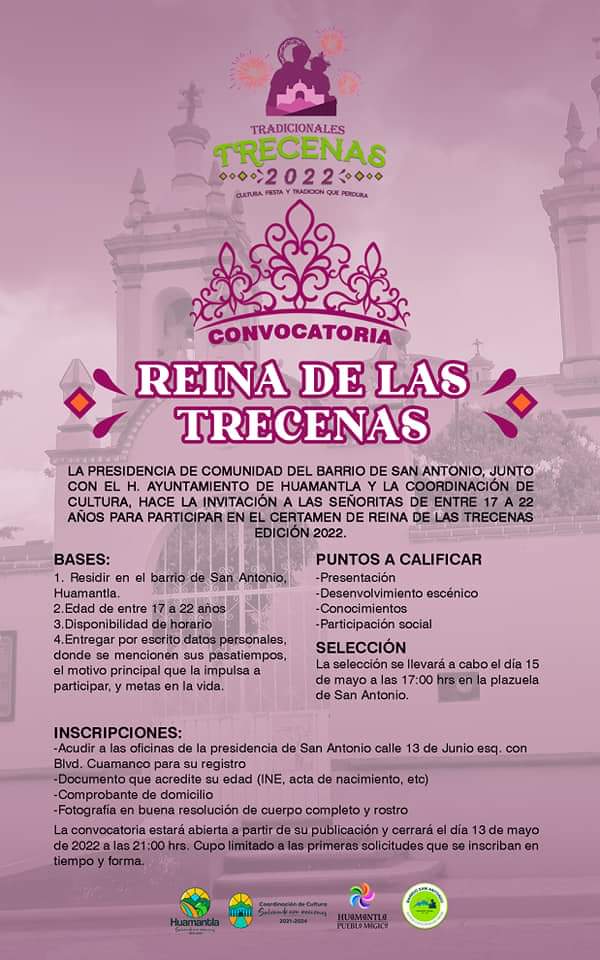 El evento en el que se determinará a la representante de las Trecenas, se llevará a cabo el día 15 de mayo a las 17:00 horas, en la plazuela del barrio de San Antonio. Por lo que quienes deseen participar deben inscribirse en las oficinas de la Presidencia de San Antonio, ubicadas en la calle 13 de junio esquina con bulevar Cuamanco.