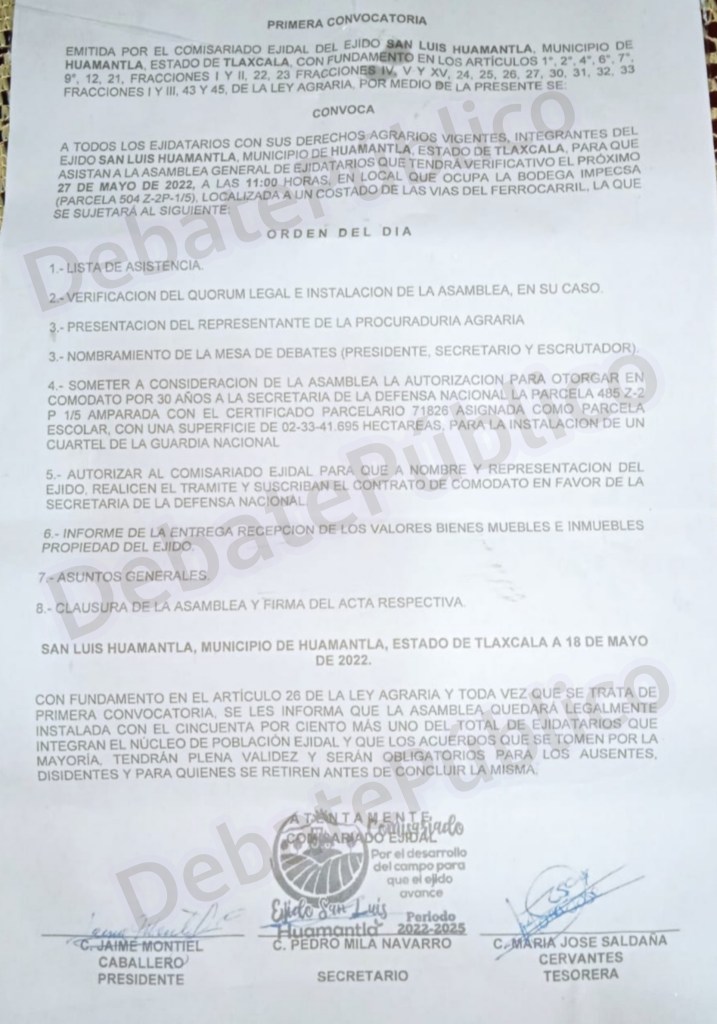 ManuelRojas.- Integrantes del Ejido San Luis, en el Municipio de Huamantla, acudieron a la reunión convocada este viernes 27 de mayo, para tratar diferentes temas como el convenio de comodato con la Guardia Nacional (GN) para instalar un cuartel, y externaron su preocupación porque el Comisariado Ejidal, Jaime Caballero no se presentó.