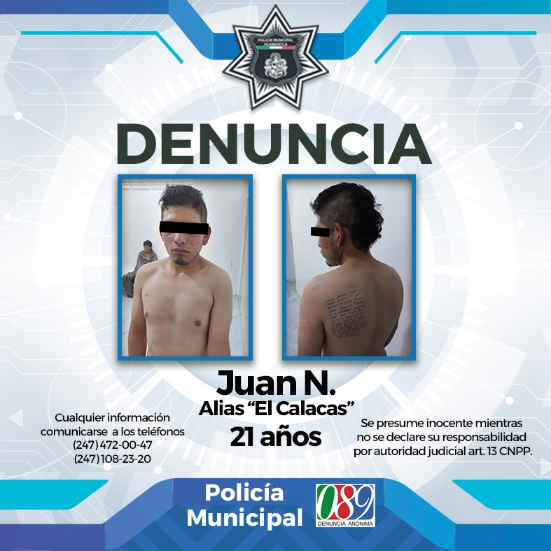 Minutos después lograron la detención de Juan N., de 21 años de edad, mejor conocido como “El Calacas”, quien además es vecino de la comunidad; por lo que después del señalamiento directo, los oficiales lograron su detención y le leyeron los derechos que le asisten para después trasladarlo a la Comisaría municipal y ser presentado ante la autoridad competente.