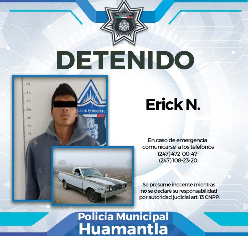 Tras entrevistarse con un testigo, personal de seguridad pública de Huamantla, aborda al ocupante de una camioneta tipo Datsun color gris con placas del estado de Puebla, quien dijo llamarse Erick N. de 20 años de edad, vecino de este municipio; pues en uno de los costados de su vehículo tenía amarrado un tubo de aluminio de 6 metros de largo que era ocupado para el sistema de riego.