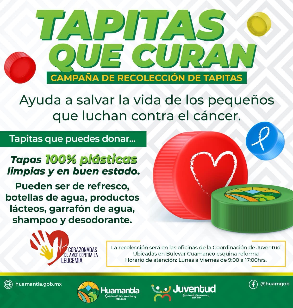 DebatePúblico.- Con el propósito de sumar acciones que permitan apoyar en su tratamiento a niñas y niños con cáncer, el H. Ayuntamiento de Huamantla que preside Salvador Santos Cedillo, a través de la Coordinación de Juventud, en colaboración con la fundación “Corazonadas de Amor Contra la Leucemia”, invitan a participar a la ciudadanía en general en la campaña “Tapitas que Curan”.
