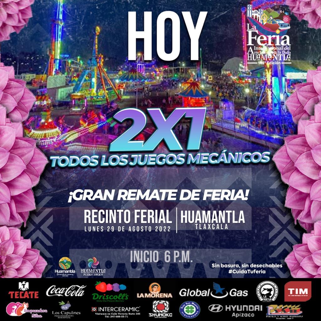DebatePúblico.- Para cerrar con broche de oro la Feria Internacional del Arte Efímero y la Dalia 2022, el H. Ayuntamiento de Huamantla y Atracciones Roca, invitan al gran remate de feria con todos los juegos mecánicos al 2×1.
