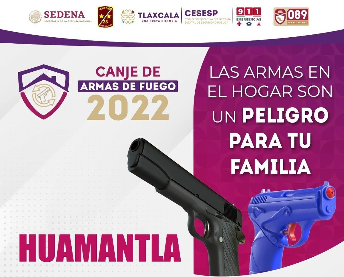 DebatePúblico.- Con el propósito de evitar accidentes producidos por arma de fuego en el hogar, el H. Ayuntamiento de Huamantla, la Secretaría de Defensa Nacional (Sedena), a través de la 23 Zona Militar, y la Comisión Ejecutiva del Sistema Estatal de Seguridad Pública (Cesesp), invitan a la ciudadanía a participar en la campaña de Canje de Armas 2022.