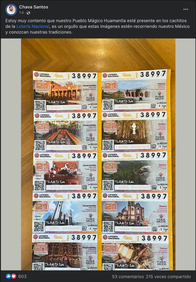 “Estoy muy contento que nuestro Pueblo Mágico Huamantla esté presente en los cachitos de la Lotería Nacional, es un orgullo que estas imágenes estén recorriendo nuestro México y conozcan nuestras tradiciones”, escribió el edil.