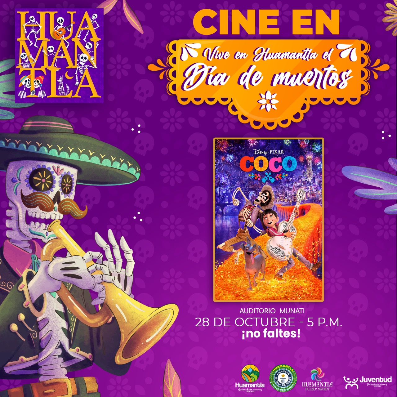 DebatePúblico.- En el marco del festival “Vive en Huamantla el Día de Muertos”, el H. Ayuntamiento de Huamantla a través de la Coordinación de Juventud invita a las y los huamantlecos a la proyección de la película “Coco”, misma que se presentará en el Museo Nacional del Títere (Munati) a las 17:00 horas.