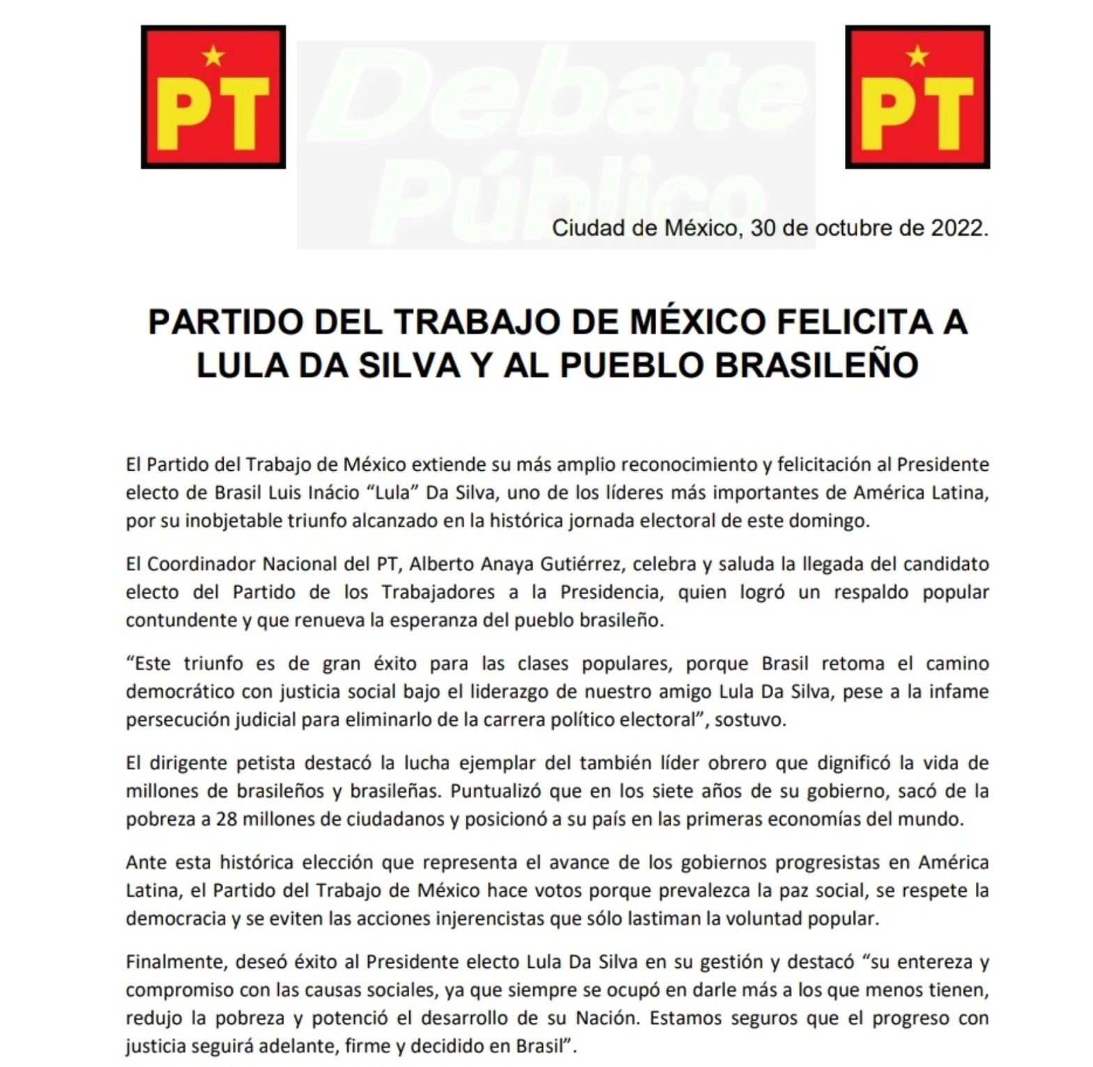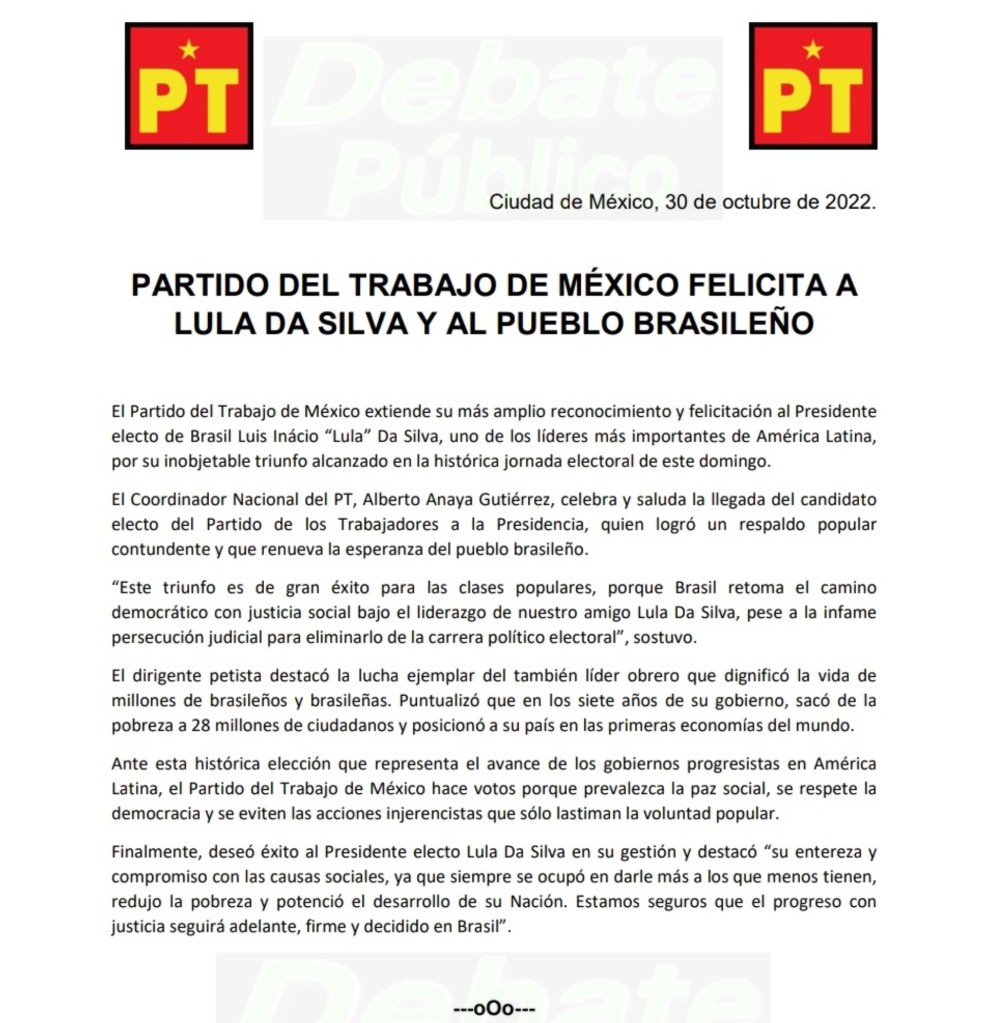 ManuelRojas.- El Grupo Parlamentario del Partido del Trabajo (GPPT), del cual forma parte el diputado federal Alejandro Aguilar López, felicita y reconoce al presidente electo de Brasil, Luis Ignacio «Lula» Da Silva, uno de los líderes más importantes de América Latina, quién este domingo 30 de octubre de manera inobjetable y contundente alcanzo el triunfo en una histórica jornada electoral.