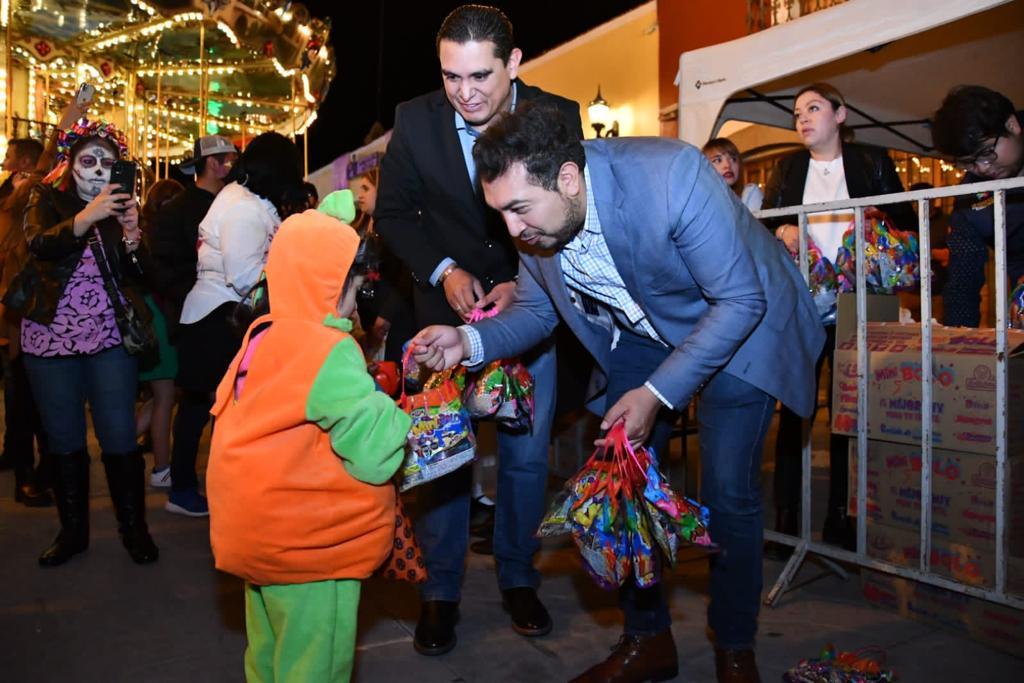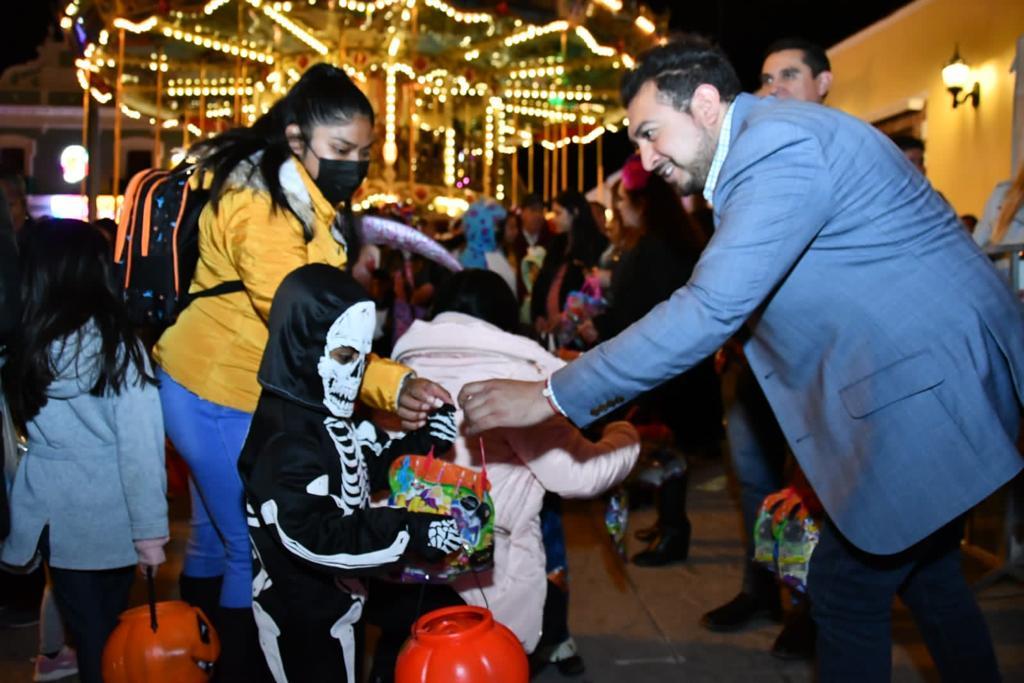 Fue ahí que el presidente municipal, Salvador Santos Cedillo, acompañado de algunas autoridades municipales, entregó dulces a miles de niños que salieron a pedir su “calaverita”, todo en un ambiente de fiesta, música y cultura.