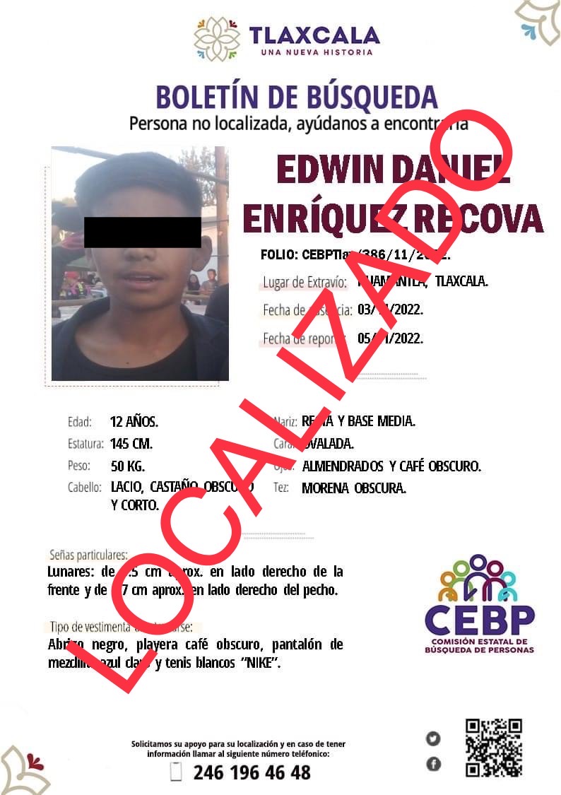 El infante de 12 años de edad de nombre Edwin N., contaba con folio de búsqueda emitido por la Comisión Estatal de Búsqueda de Personas (CEBP), con número CEBPTlax/386/11/2022 desde el 5 de noviembre.