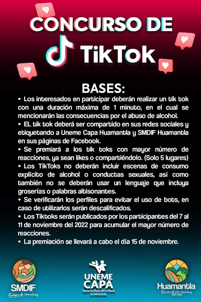 DebatePúblico.- EL H. Ayuntamiento de Huamantla, a través del Sistema Municipal para el Desarrollo Integral de la Familia (DIF) Huamantla, y la Unidad de Especialidades Médicas del Centro de Atención Primaria en Adicciones (UNEME CAPA Huamantla), invitan a participar en el concurso de Tik Tok con motivo de la Conmemoración del Día Nacional Contra el Uso Nocivo de Alcohol, bajo el lema de: “El A-B-C del Uso Nocivo del Alcohol”.