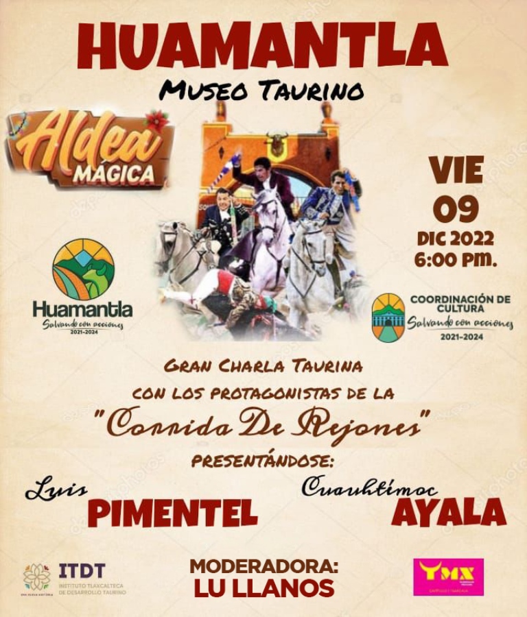 DebatePúblico.- Con el objetivo de contribuir a la difusión de la cultura taurina, el H. Ayuntamiento de Huamantla que preside Salvador Santos Cedillo, presentará una charla con los protagonistas de la “Corrida de Rejones», en el marco de la Aldea Mágica 2022.