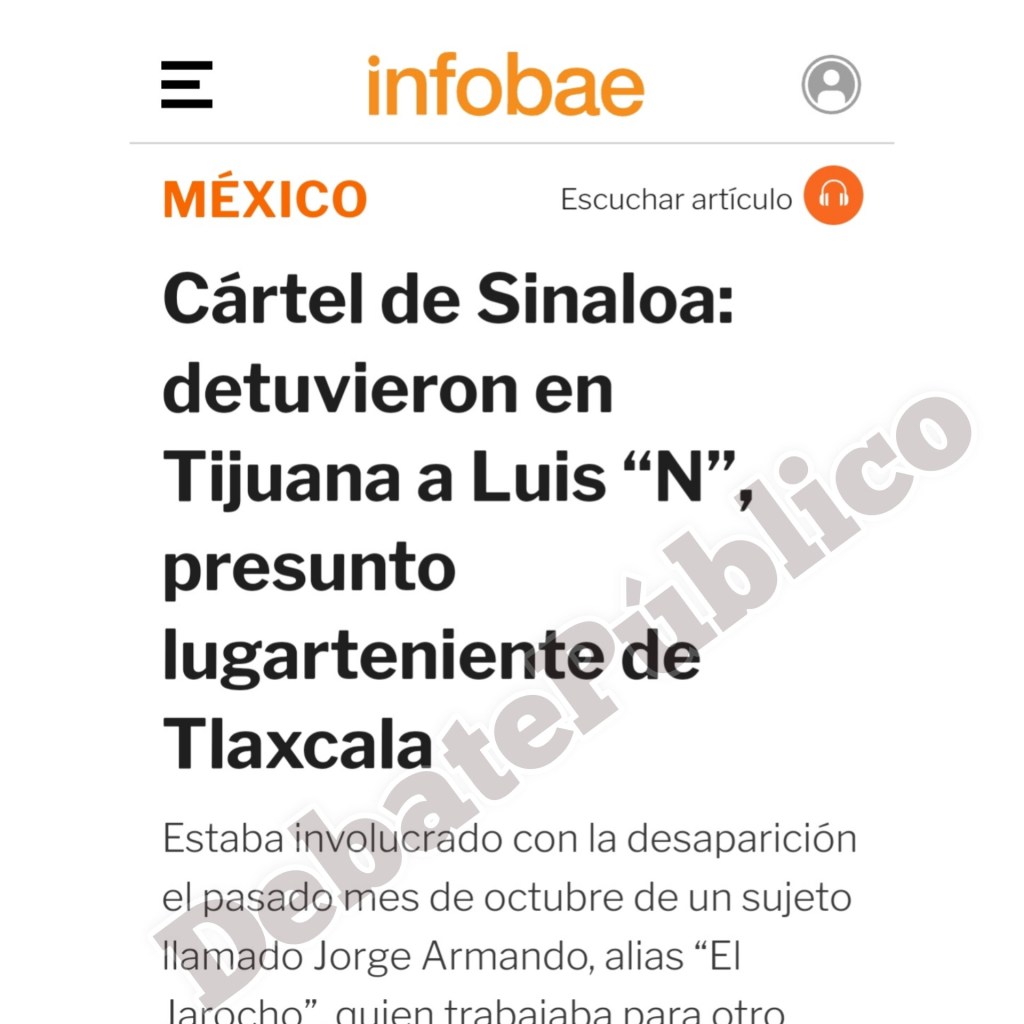 DebatePúblico.- El medio de comunicación digital Infobae, público este viernes 23 de diciembre, que «La Fiscalía General del Estado (FGE) de Baja California detuvo a Julio César “N”, identificado por las autoridades como un representante del Cártel de Sinaloa en el estado de Tlaxcala».