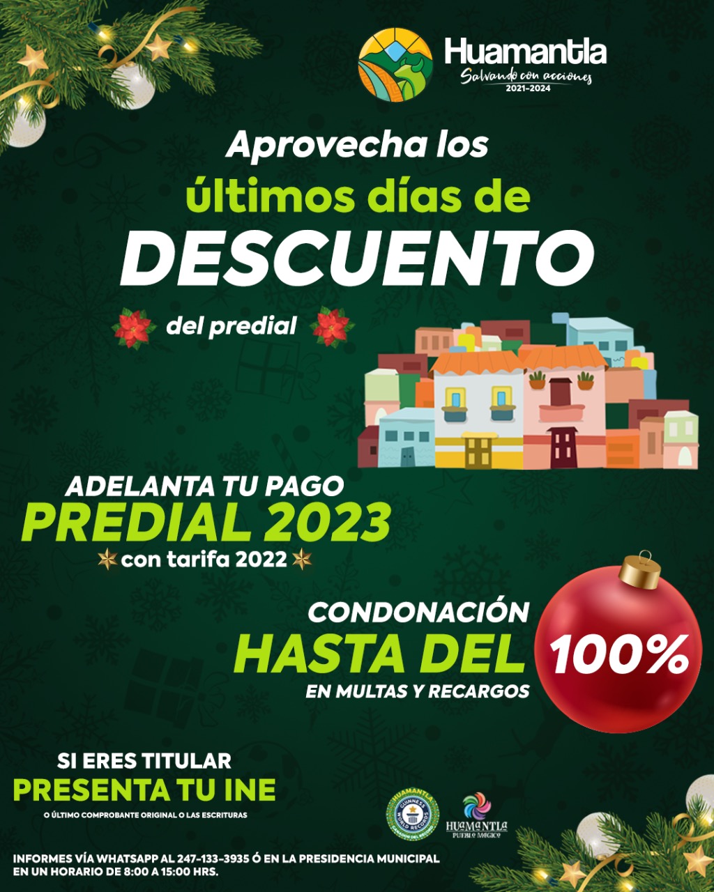 DebatePúblico.- Con el objetivo de apoyar la economía de las familias huamantlecas y que puedan dar mayor certeza y orden a su patrimonio, el H. Ayuntamiento de Huamantla que encabeza Salvador Santos Cedillo, invita a la población a aprovechar los últimos días para realizar el pago anticipado del predial 2023 con la tarifa 2022.
