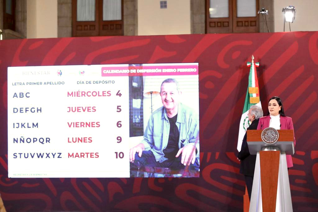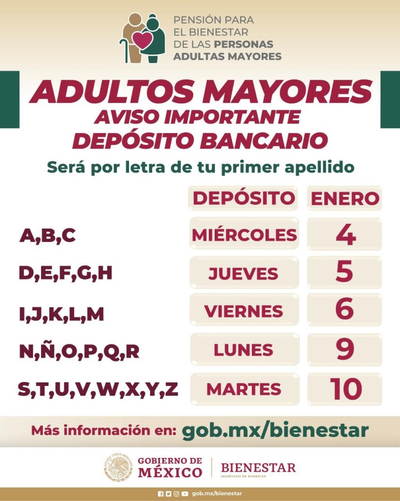 Informó que del 4 al 10 de enero se realizará la dispersión de pagos correspondiente al bimestre enero-febrero, ya con el incremento, y para mejor atención de los derechohabientes este depósito se realizará de acuerdo con la letra del primer apellido de las personas adultas mayores que cobran con tarjeta de cualquier institución bancaria.