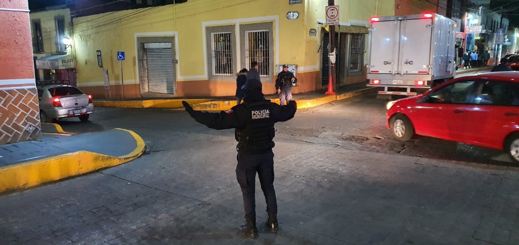 - Personal de Seguridad Pública municipal ejecuta un operativo para blindar la zona de comercio en el primer cuadro de la ciudad.