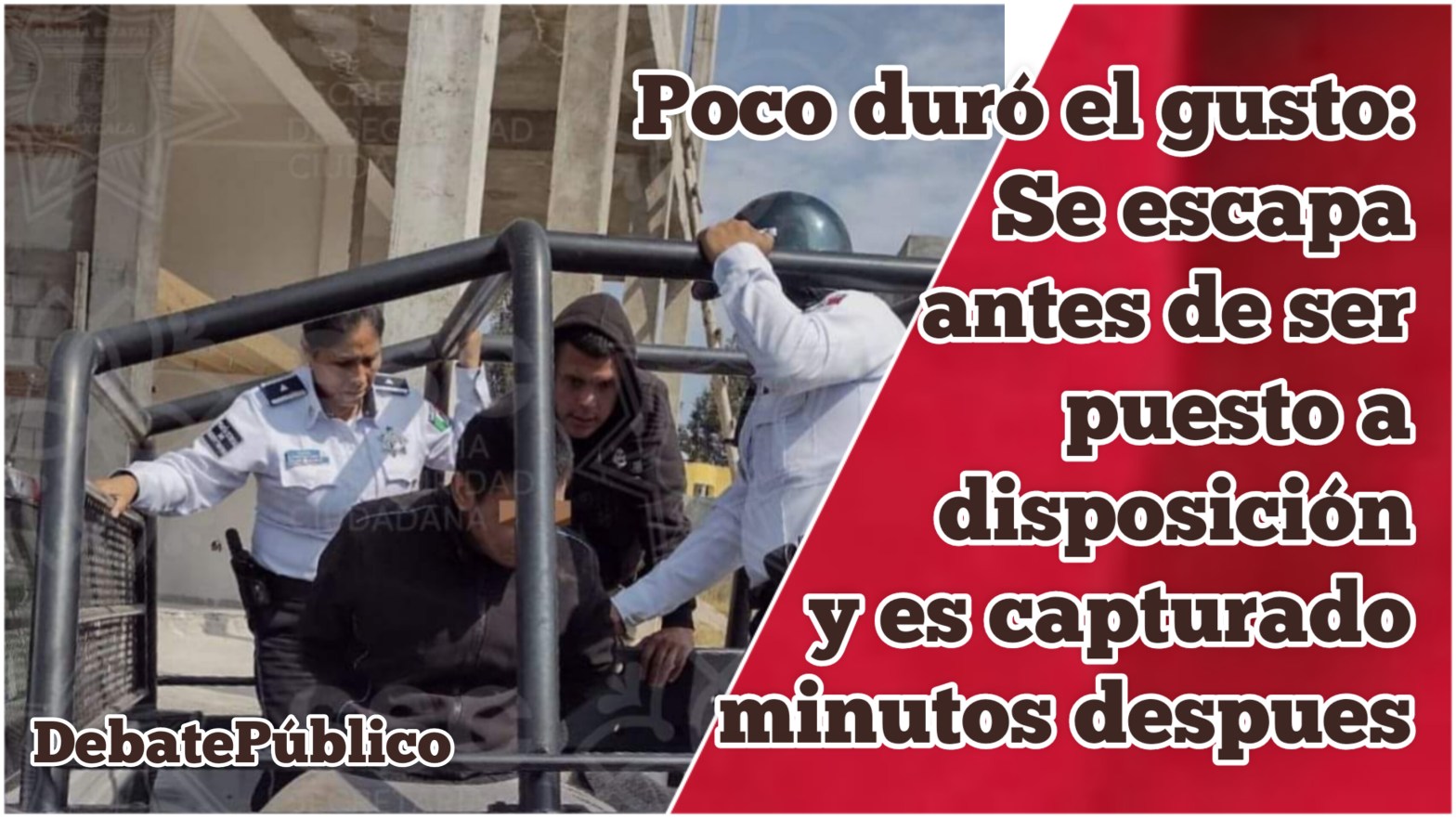 DebatePúblico.- En apoyo a la Policía Municipal de Tlaxco, elementos de la Dirección de la Policía Estatal de Caminos y Vialidad lograron la reaprehensión de un sujeto que intentó darse la fuga cuando era ingresado a la Fiscalía General de la República, delegación Tlaxcala, para ser puesto a disposición.