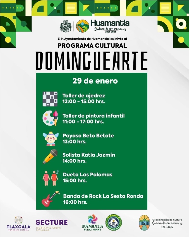 DebatePúblico.- La coordinación de Cultura del Ayuntamiento de Huamantla, invita a no perderse cada domingo el escenario principal del programa “Dominguearte”, que ofrece a la ciudadanía una amplia cartelera artística que incluye una gran variedad de presentaciones.