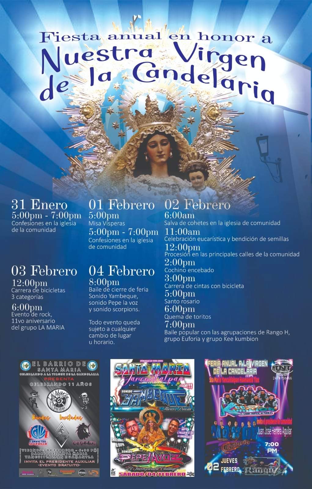 El Presidente de Comunidad expuso que dentro de los festejos, está programado la realización de eventos musicales y el primero de ellos es el día 2 de febrero con la participación de los grupos: Rango H, Kecumbion y Euforia.