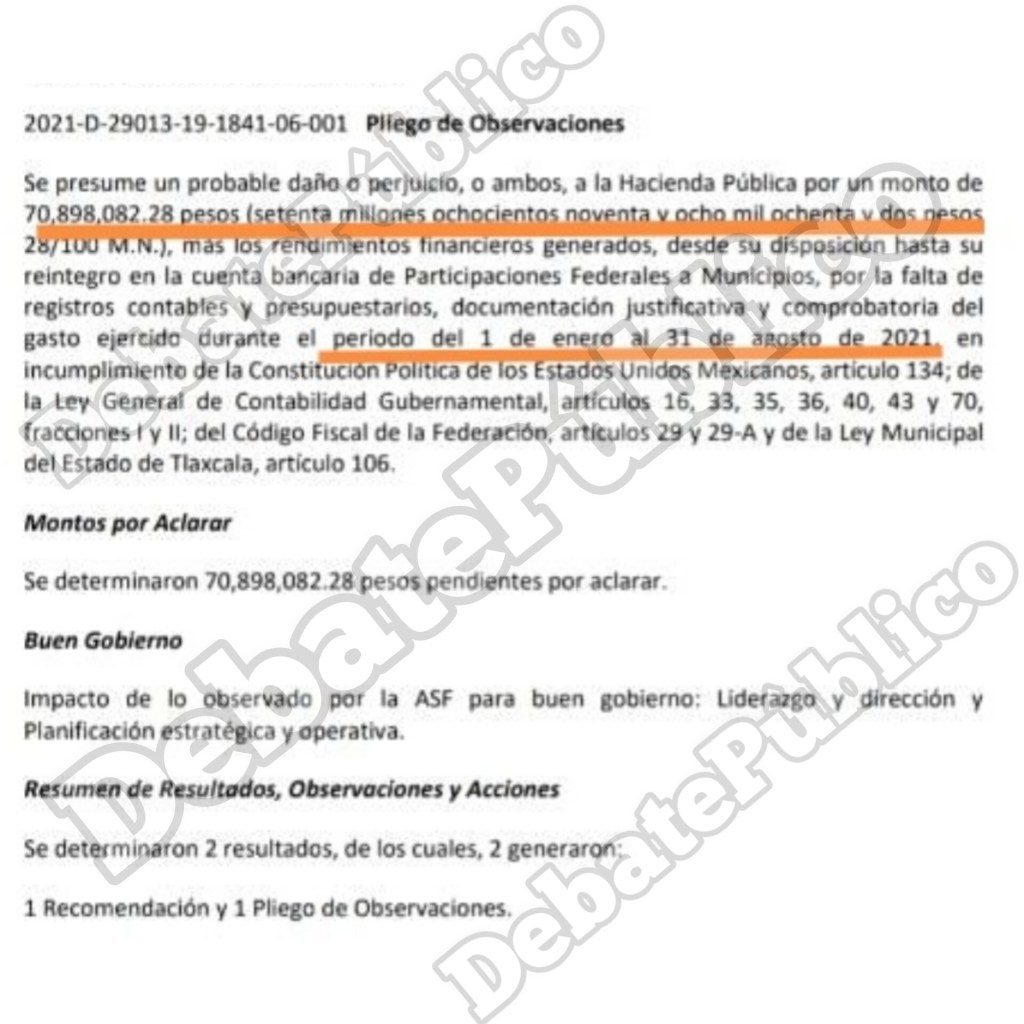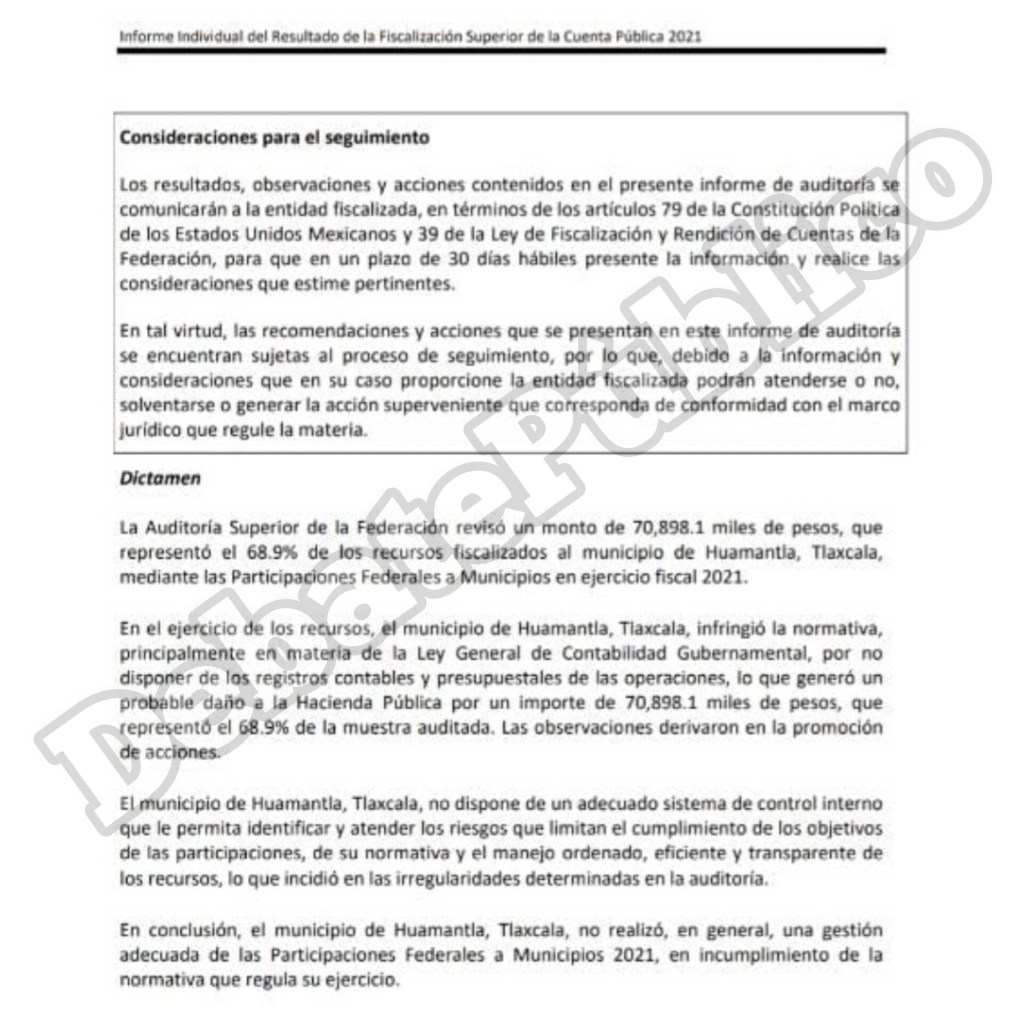 ManuelRojas.- De acuerdo al informe de la Auditoría Superior de la Federación, existe un probable daño patrimonial a las finanzas del Municipio de Huamantla durante los últimos ocho meses de la administración del priísta Jorge Sánchez Jasso, que asciende a 70 millones 898 mil pesos.