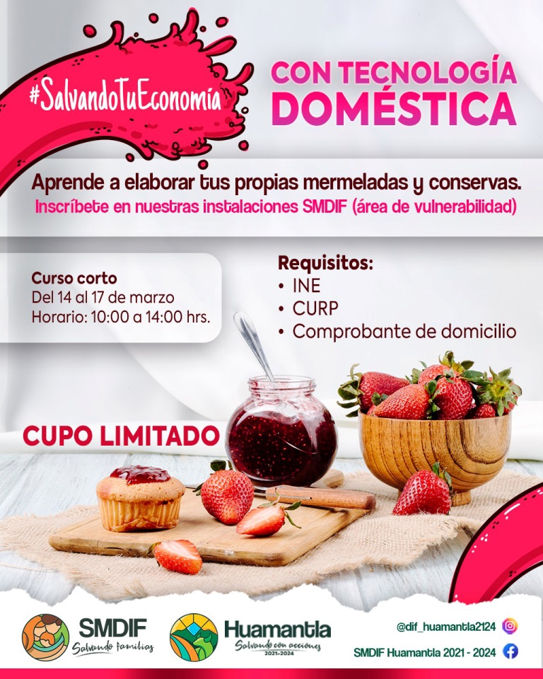 DebatePúblico.- Con el objetivo de que las y los huamantlecos aprendan a preparar mermeladas y conservas, y con ello generar un ingreso económico, el Sistema Municipal para el Desarrollo Integral de la Familia (DIF) Huamantla, convoca al curso “Salvando tu economía con tecnología doméstica”, el cual se desarrollará del 14 al 17 de marzo.