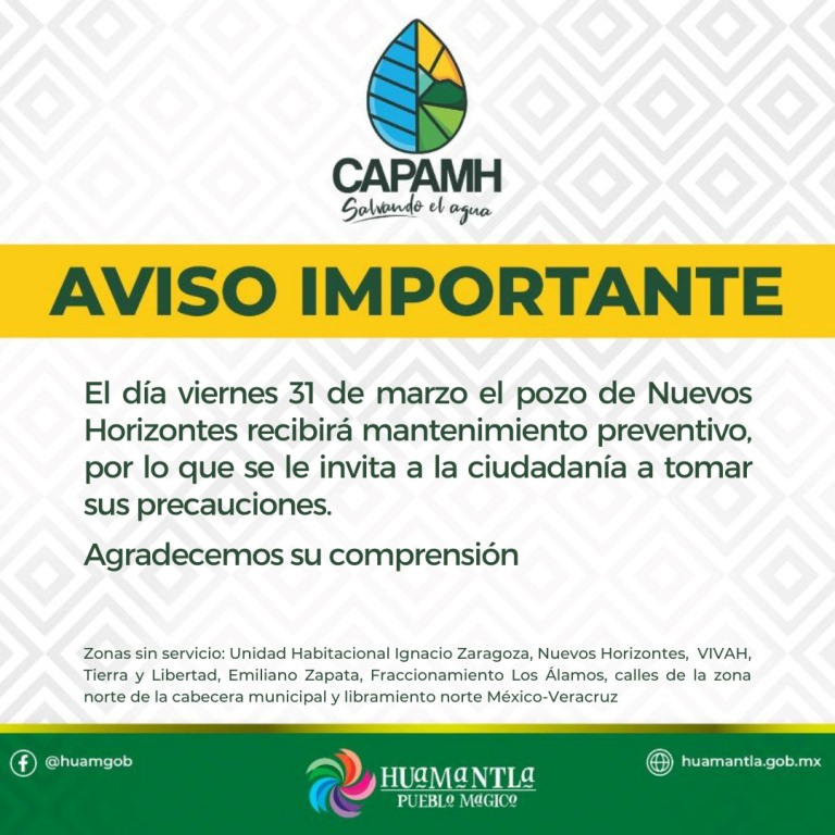 DebatePúblico.- Para realizar maniobras de mantenimiento en el pozo de Nuevos Horizontes, la Comisión de Agua Potable y Alcantarillado del Municipio de Huamantla (Capamh), informa que el día de mañana 31 de marzo se suspenderá el servicio, por lo que llama a la ciudadanía a tomar sus precauciones.