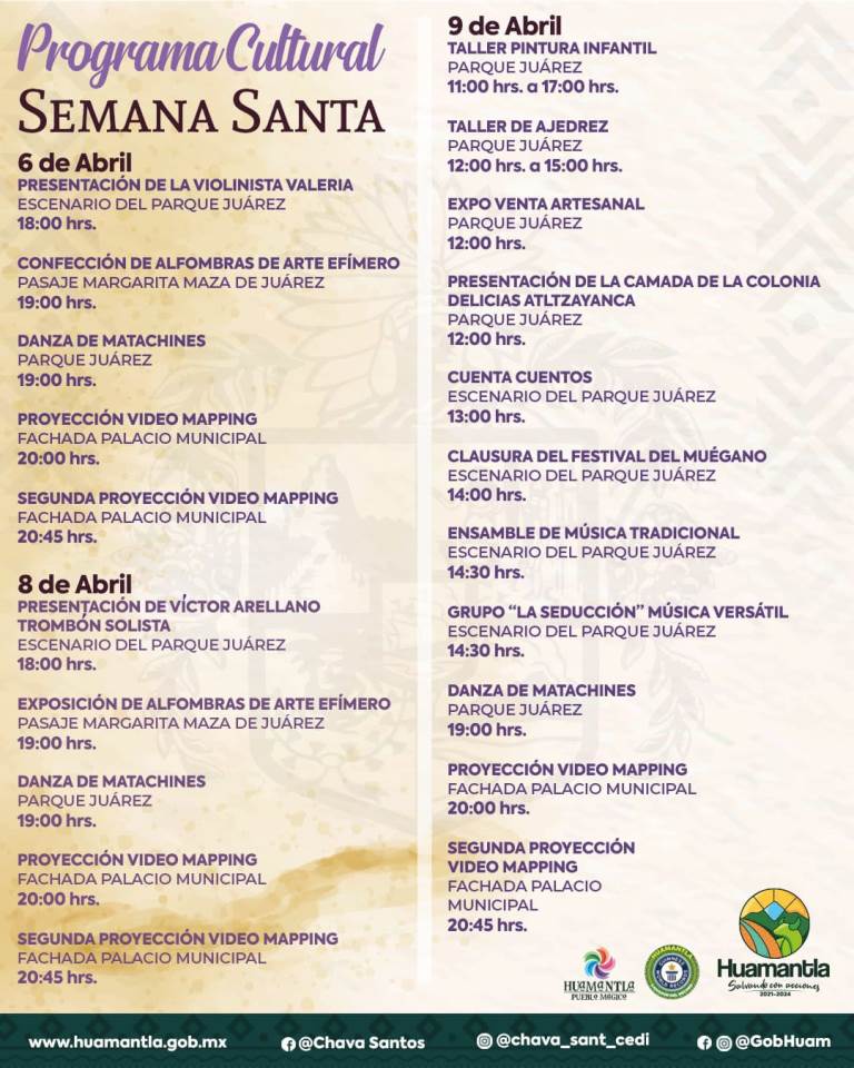 DebatePúblico.- El H. Ayuntamiento de Huamantla a través de la Coordinación de Cultura, invita a toda la ciudadanía a asistir al Programa Cultural de Semana Santa, que tendrá lugar en el Parque Juárez durante estos días donde podrán disfrutar de diversas actividades artísticas y culturales en compañía de la familia.