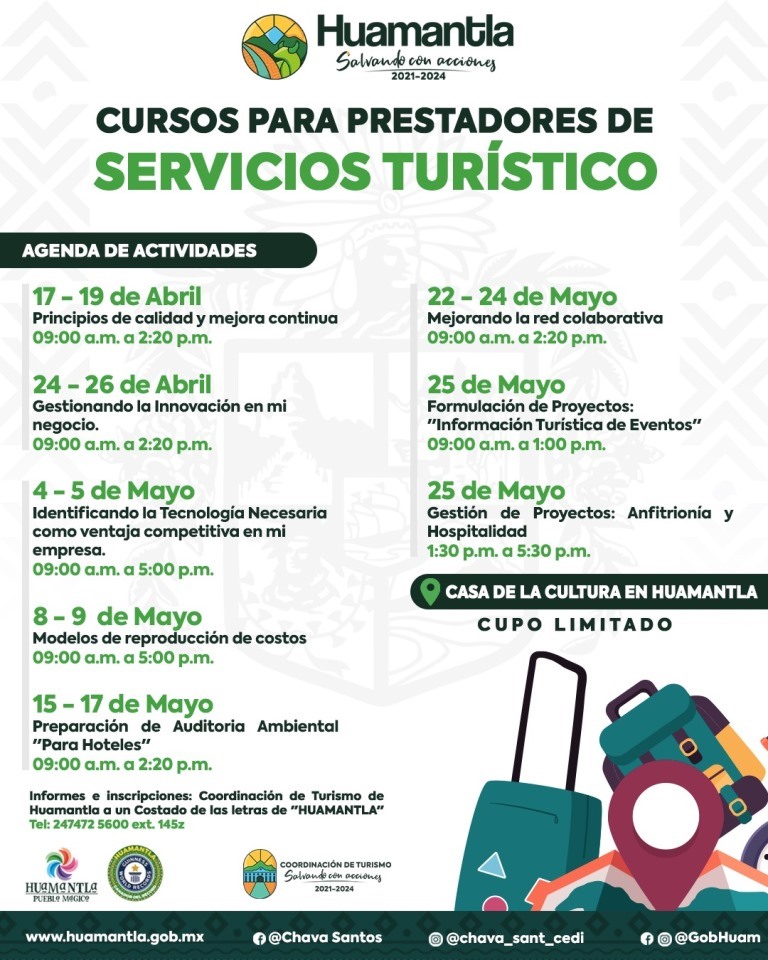DebatePúblico.- El Gobierno Municipal de Huamantla, a través de la Coordinación de Turismo y la Secretaría de Turismo de Tlaxcala (Secture), invitan a los prestadores de servicios turísticos a capacitarse en talleres y cursos para mejorar su negocio, servicio o emprendimiento.