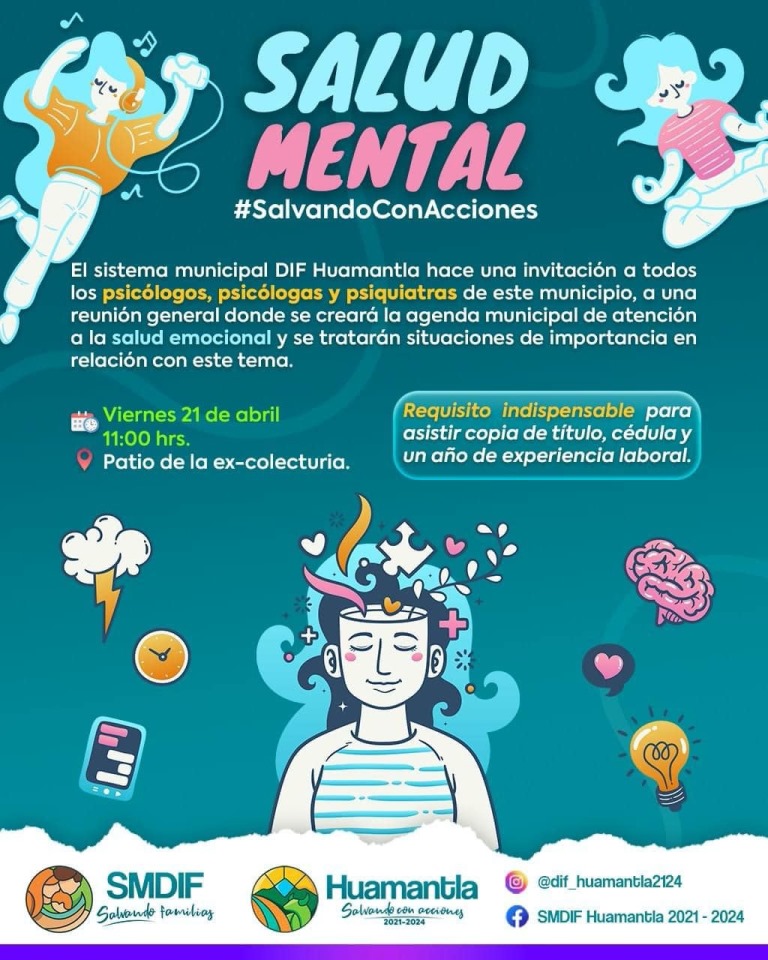 DebatePúblico.- El Sistema Municipal para el Desarrollo Integral de la Familia (DIF) Huamantla, convoca a todos los psicólogos, psicólogas y psiquiatras del municipio a participar en una reunión general para plantear una agenda de atención a la salud emocional.